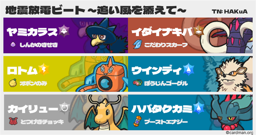 相手の構築に寄っては先発にウインディやハバタクカミを置くこともありますが、イダイナキバとロトムで圧を掛けながらサイクル展開に持ち込む並びとなっております。